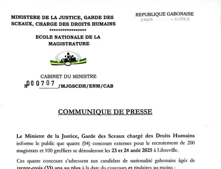 Par le biais d’un communiqué rendu public le 15 juillet 2025, le ministre de la Justice, Garde des sceaux, chargé des droits humains, Séraphin Akure-Davain, annonce l’organisation de quatre concours externes en vue du recrutement de 200 magistrats et 100 greffiers. Les épreuves écrites desdits concours vont se dérouler les 23 et 24 août 2025 à Libreville.