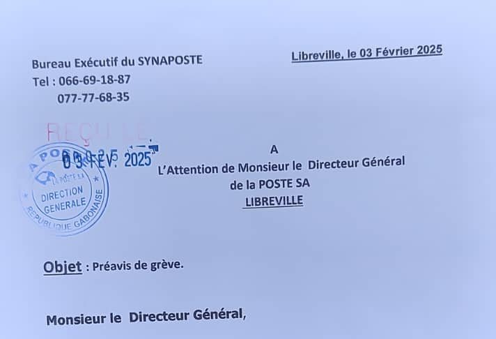 Dans une correspondance, datée du 3 février 2025, adressée au directeur général de la Poste S.A, les adhérents de SYNAPOSTE, informe la direction générale de leur décision prise en assemblée générale, de leur entrée en grève, après un préavis de 10 jours, sur toute l’étendue du territoire national.